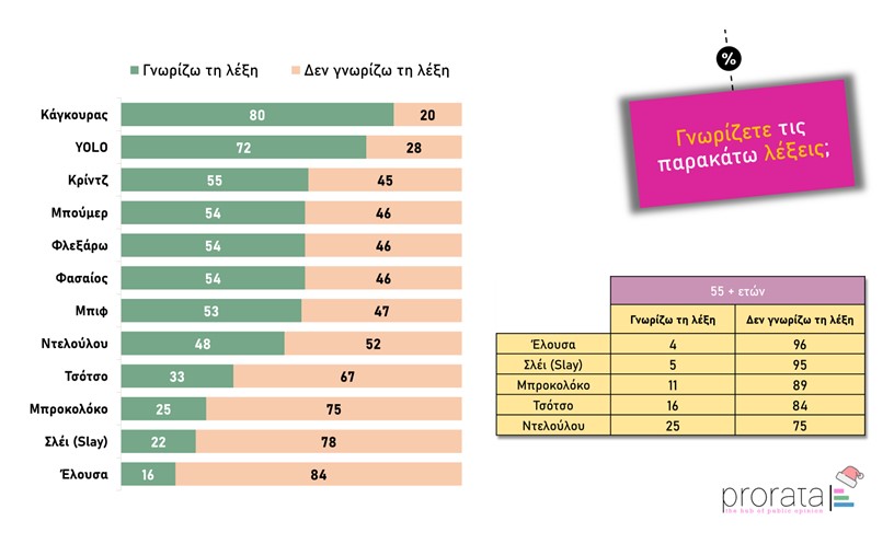 Η εορταστική έρευνα της Prorata, ωστόσο διερεύνησε και θεματικές που αφορούν στο λεξιλόγιο της Gen-Z (και όχι μόνο). Πόσο καλά γνωρίζουμε τι σημαίνει «κρίντζ», «φλεξάρω», «ντελούλου» και «φασαίος»; Αν και η ελληνική κοινωνία μοιάζει εξοικειωμένη με slang λέξεις, όπως «κάγκουρας» και «YOLO» δεν συμβαίνει το ίδιο με άλλες, λιγότερο γνωστές στο ευρύ κοινό, όπως «τσότσο», «μπροκολόκο», «σλέι» και «λούζω».