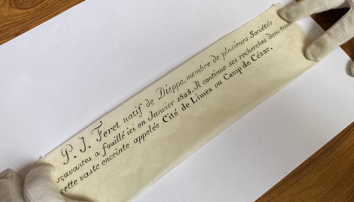 Όταν άνοιξαν το μήνυμα, έγραφε: «Ο P.J Féret, κάτοικος της Διέππης και μέλος διαφόρων πνευματικών εταιρειών, πραγματοποίησε ανασκαφές εδώ τον Ιανουάριο του 1825. Συνεχίζει τις έρευνές του στην περιοχή γνωστή ως Cité de Limes ή Στρατόπεδο του Καίσαρα».