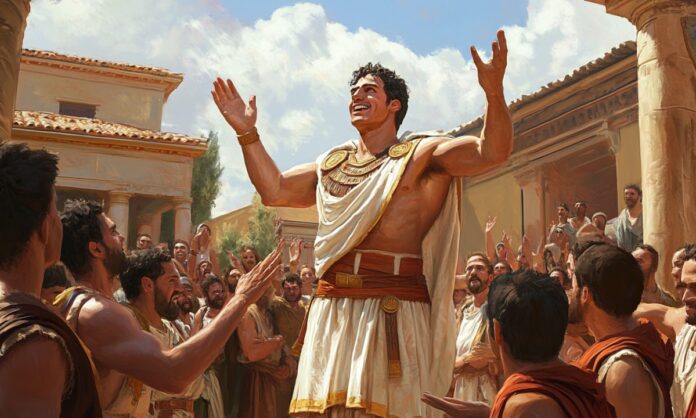 Σύμφωνα με τον μύθο, ένας αθλητής καυχιόταν ότι, κατά τη διάρκεια αγώνων στη Ρόδο, είχε επιτύχει ένα εξαιρετικό άλμα, το οποίο κανείς άλλος δεν μπορούσε να επαναλάβει. Όταν οι ακροατές του εξέφραζαν αμφιβολίες, εκείνος τους προέτρεπε να ταξιδέψουν στη Ρόδο για να επιβεβαιώσουν τα λεγόμενά του από αυτόπτες μάρτυρες. Ένας από τους παρευρισκόμενους, θέλοντας να τον προκαλέσει, του είπε: «Αυτού γαρ και Ρόδος και πήδημα», δηλαδή «εδώ είναι η Ρόδος και το άλμα». Με αυτόν τον τρόπο, τον κάλεσε να αποδείξει επιτόπου την ικανότητά του, χωρίς να επικαλείται μακρινούς τόπους ή μάρτυρες.