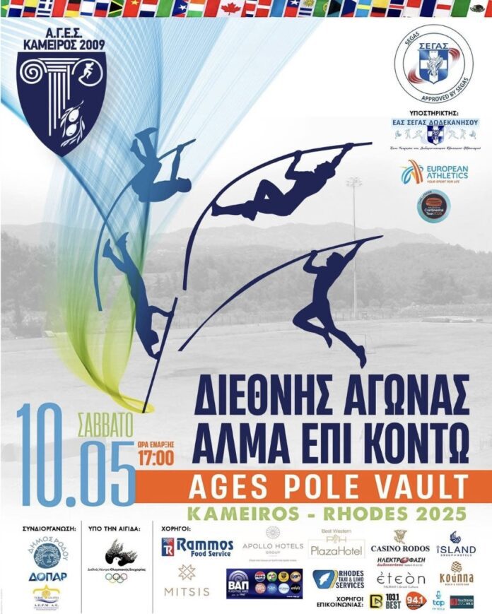 Το Αθλητικό Σωματείο ΑΓΕΣ ΚΑΜΕΙΡΟΣ 2009 συνδιοργανώνει με τον Δήμο Ρόδου, τη Δ.Ε.Ρ.Μ.Α.Ε. και τη Διεύθυνση Δ.Ο.Π.Α.Ρ. του Δήμου Ρόδου, το Σάββατο 10 Μαΐου 2025 στην πλατεία του Δημαρχείου της Ρόδου, τον διεθνή αγώνα άλματος επί κοντώ ανδρών και γυναικών “AGES Pole Vault Kameiros Rhodes 2025” με τη συμμετοχή Ελλήνων και ξένων πρωταθλητών. Πρόκειται για μια σημαντική πρωτοβουλία που δεν έχει επαναληφθεί στο νησί και αναμένεται να έχει μεγάλη απήχηση στο κοινό της Ρόδου είτε πρόκειται για τους μόνιμους κατοίκους, είτε για ανθρώπους που βρίσκονται στο μέρος για τις διακοπές τους. Η ώρα έναρξης του γεγονότος είναι στις 5μμ με τον αγώνα των γυναικών να προηγείται και να έπεται εκείνος των ανδρών στις 7.30μμ. Η προσέλευση του κοινού είναι ανοιχτή και η είσοδος ελεύθερη.