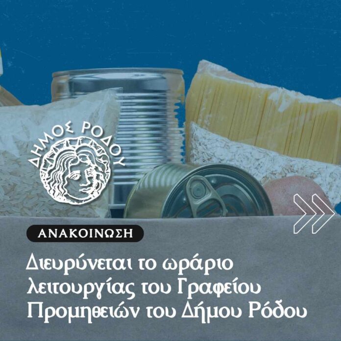 Λόγω της τεράστιας ανταπόκρισης για τη συγκέντρωση ειδών πρώτης στους πλημμυροπαθείς συμπολίτες μας, διευρύνεται το ωράριο λειτουργίας του Γραφείου Προμηθειών του Δήμου Ρόδου, στην οδό Καποδιστρίου 3-5 για σήμερα Τετάρτη, αύριο Πέμπτη και μεθαύριο Παρασκευή.