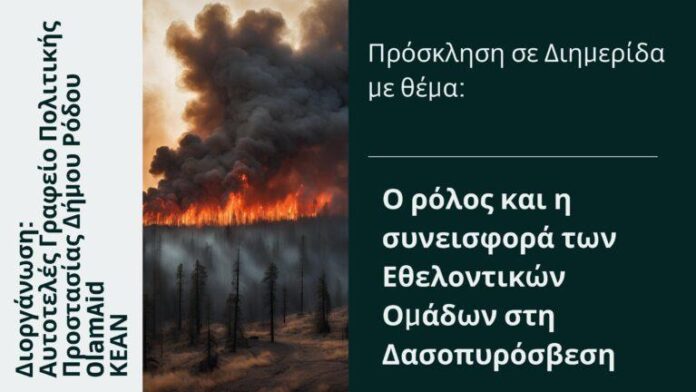 Ο Δήμος Ρόδου και το Αυτοτελές Γραφείο Πολιτικής Προστασίας, σε συνδιοργάνωση με την OlamAid, το ZWST και το ΚΕΑΝ (Κύτταρο Εναλλακτικών Αναζητήσεων Νέων), στο πλαίσιο του έργου «Greece Wildfires Emergency Response», διοργανώνει διημερίδα με θέμα: “Ο ρόλος και η συνεισφορά των Εθελοντικών Ομάδων στη Δασοπυρόσβεση”.