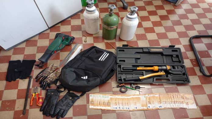 • Πλήθος διαρρηκτικών εργαλείων, όπως μπουκάλες οξυγόνου με στόμια, ηλεκτρική σέγα, λοστός, φακός, γάντια, κόφτες και κατσαβίδια.