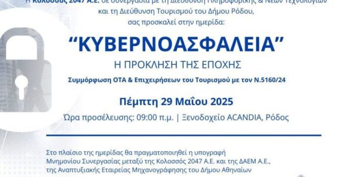 Ημερίδα με τίτλο «ΚΥΒΕΡΝΟΑΣΦΑΛΕΙΑ – Η ΠΡΟΚΛΗΣΗ ΤΗΣ ΕΠΟΧΗΣ» (Συμμόρφωση ΟΤΑ & Επιχειρήσεων του Τουρισμού με τον Ν.5160/24) διοργανώνει ο Αναπτυξιακός Οργανισμός του Δήμου Ρόδου «ΚΟΛΟΣΣΟΣ 2047 Α.Ε.», σε συνεργασία με τη Διεύθυνση Πληροφορικής & Νέων Τεχνολογιών και τη Διεύθυνση Τουρισμού του Δήμου Ρόδου.