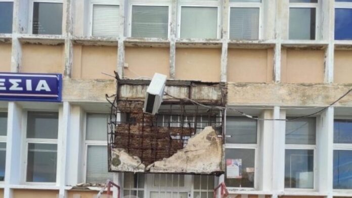 Ανυπολόγιστες είναι οι καταστροφές σε πολλές περιοχές του νησιού. Σήμερα το πρωί κατέρρευσε τμήμα μπαλκονιού της κεντρικής εισόδου στην υπηρεσία του ΟΑΕΔ.