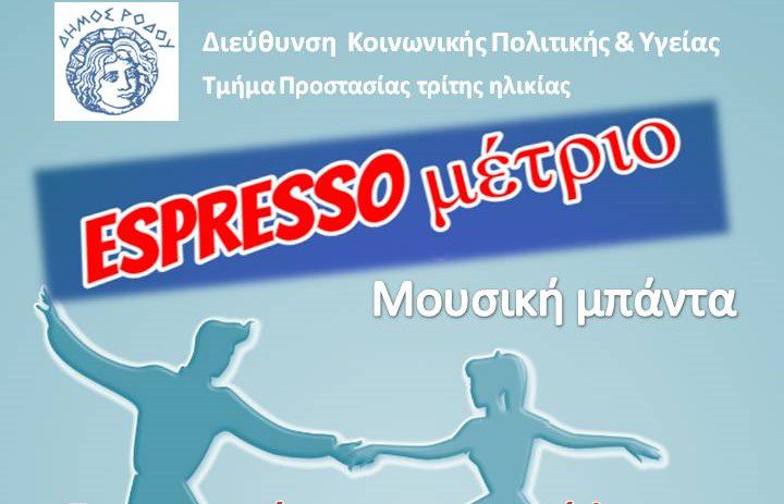 Την Πέμπτη 30 Οκτωβρίου 2025, στις 11:00 π.μ., το μουσικό συγκρότημα «Espresso Μέτριο», αποτελούμενο από τη Νεφέλη Σολομών (φωνή, φλάουτο), τον Μάριο Σκουτέλη (φωνή, κοντραμπάσο) και τον Αρτέμη Κυρτάσογλου (φωνή, κιθάρα), θα γεμίσει το ΚΑΠΗ με αγαπημένες μελωδίες των δεκαετιών του ’60 και του ’70.