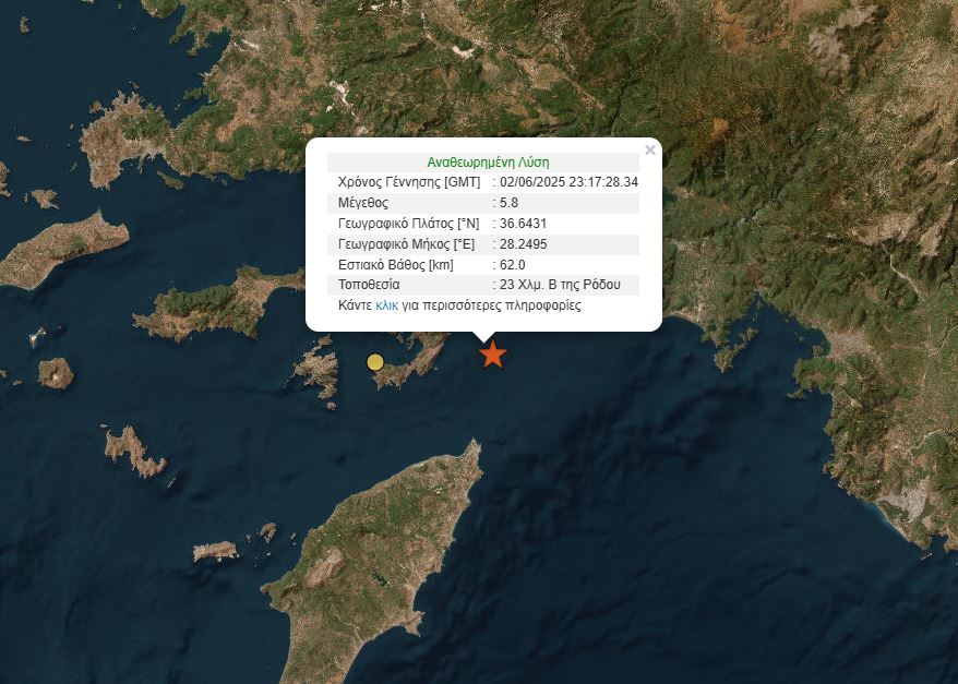 Ισχυρός σεισμός μεγέθους 5,8 βαθμών της κλίμακας Ρίχτερ σημειώθηκε στις 02: 17 τα ξημερώματα στο θαλάσσιο χώρο μεταξύ Ρόδου και Τουρκίας.