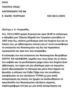 ΚΟΙΝΩΝΙΑΥΓΕΙΑ Καταγγελία της οικογένειας Μ. Τζόγια για αμέλεια στο Νοσοκομείο Κω – Στον Υπουργό Υγείας στρέφονται οι συγγενείς 1 December 2025 0 FacebookTwitter