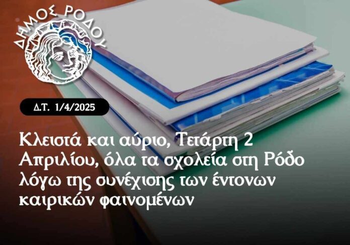 Με απόφαση του Δημάρχου Ρόδου, Αλέξανδρου Κολιάδη, τα σχολεία όλων των βαθμίδων του νησιού (νηπιαγωγεία, δημοτικά, γυμνάσια και λύκεια), καθώς και οι παιδικοί σταθμοί, θα παραμείνουν κλειστά και αύριο, Τετάρτη 2 Απριλίου 2025, λόγω της συνέχισης των έντονων καιρικών φαινομένων που επικρατούν στην περιοχή μας, σύμφωνα με τις προβλέψεις της Εθνικής Μετεωρολογικής Υπηρεσίας (ΕΜΥ).