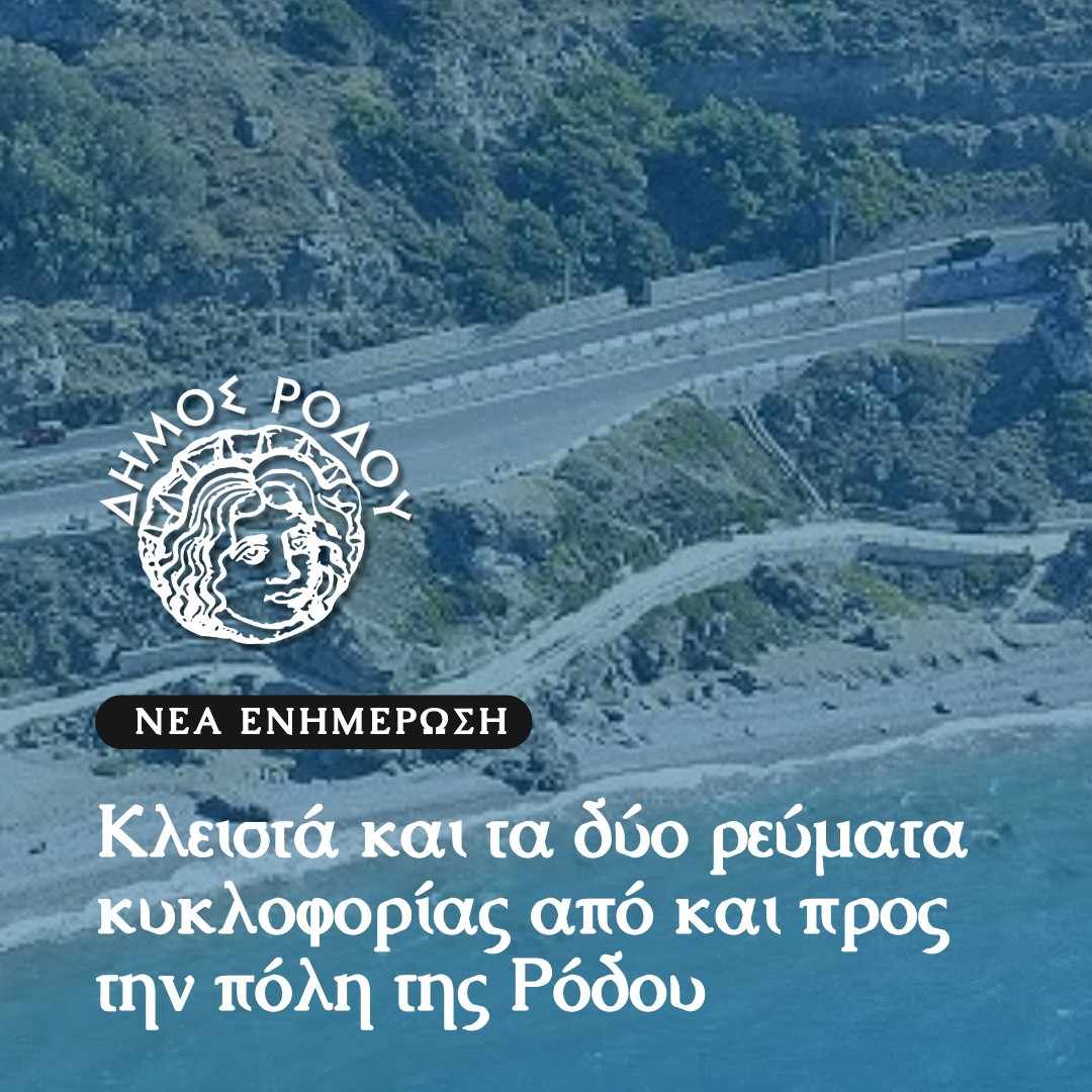 Ο Δήμος Ρόδου ενημερώνει ότι κρίνεται αναγκαίο να κλείσουν και τα δύο ρεύματα κυκλοφορίας από και προς την πόλη της Ρόδου, από τον κόμβο της Φανερωμένης μέχρι και τις Κάτω Πέτρες όπως επίσης ο πεζόδρομος στις Κάτω Πέτρες.