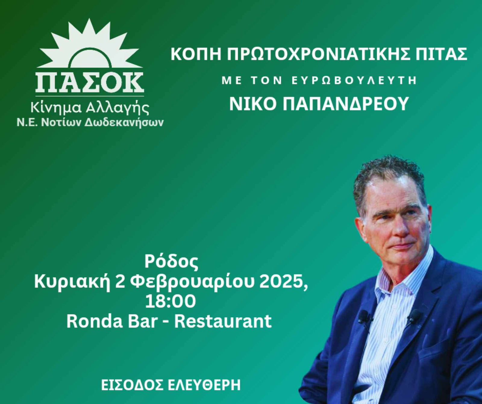 Η Νομαρχιακή Επιτροπή ΠΑΣΟΚ – Κίνημα Αλλαγής Νοτίων Δωδεκανήσων σας προσκαλεί στην καθιερωμένη εκδήλωση κοπής της πρωτοχρονιάτικης πίτας, που θα πραγματοποιηθεί την Κυριακή 2 Φεβρουαρίου, στις 6:00 μ.μ., στο Ronda Bar Restaurant στη Ρόδο.