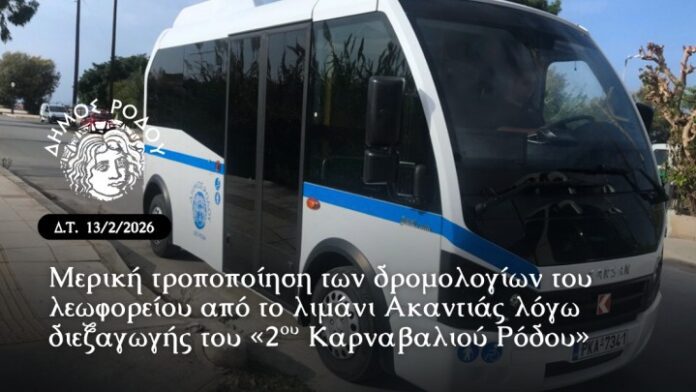 Η Διεύθυνση Συγκοινωνίας Δήμου Ρόδου ενημερώνει το επιβατικό κοινό ότι, λόγω της διεξαγωγής του «2ου Καρναβαλιού Ρόδου», το Σάββατο 14 Φεβρουαρίου θα ισχύσουν προσωρινές τροποποιήσεις στα δρομολόγια των δημοτικών λεωφορείων.