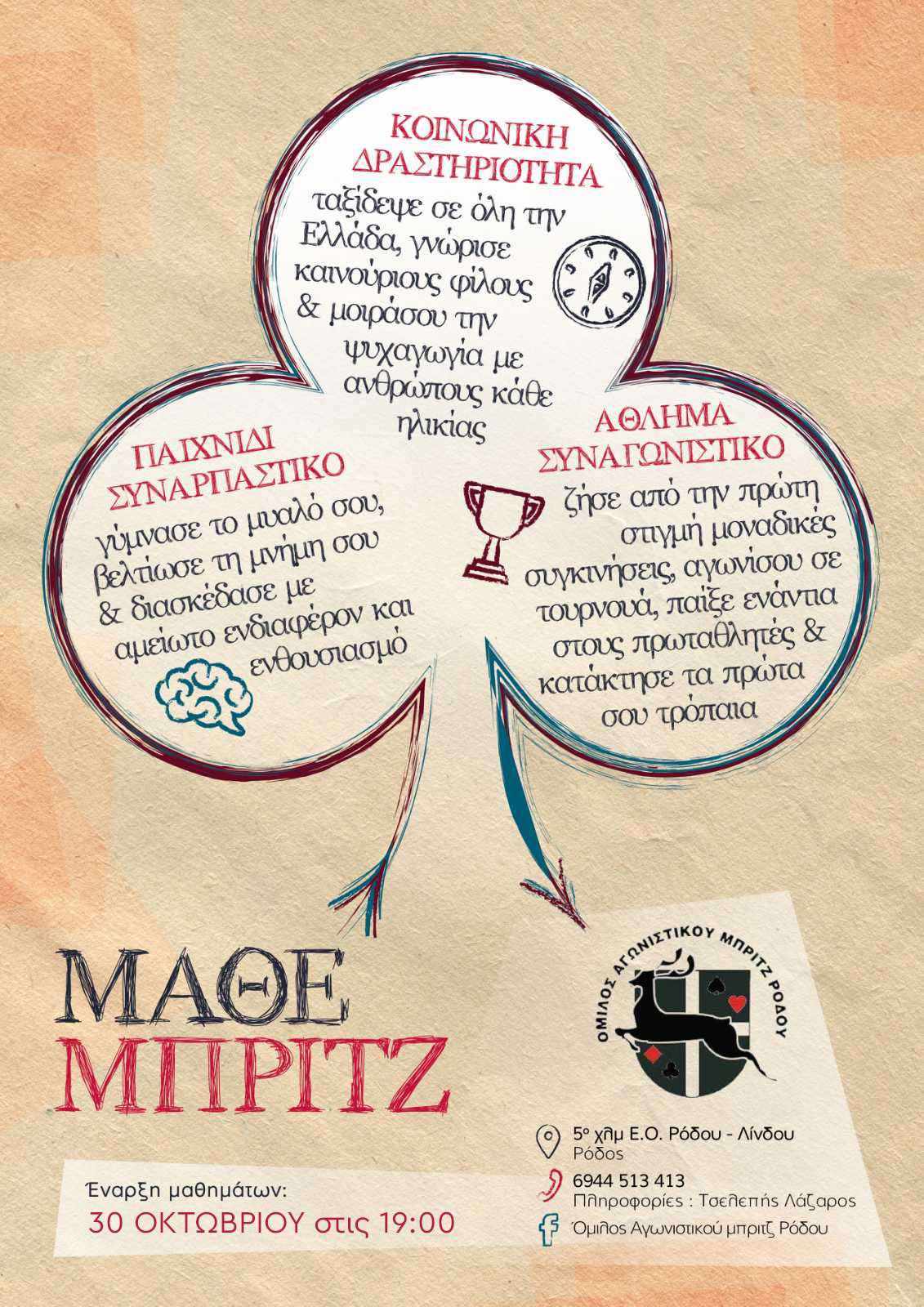 Ο Όμιλος Αγωνιστικού Μπριτζ Ρόδου (ΟΑΜΡ) ανακοινώνει την έναρξη των μαθημάτων αρχαρίων για το συναρπαστικό πνευματικό άθλημα του Μπριτζ την Τετάρτη 30 Οκτωβρίου 2024. Τα μαθήματα θα πραγματοποιούνται στις 19:00 στις εγκαταστάσεις του Ομίλου στο 5ο χλμ. της Εθνικής Οδού Ρόδου – Λίνδου, απέναντι από το Public Home.