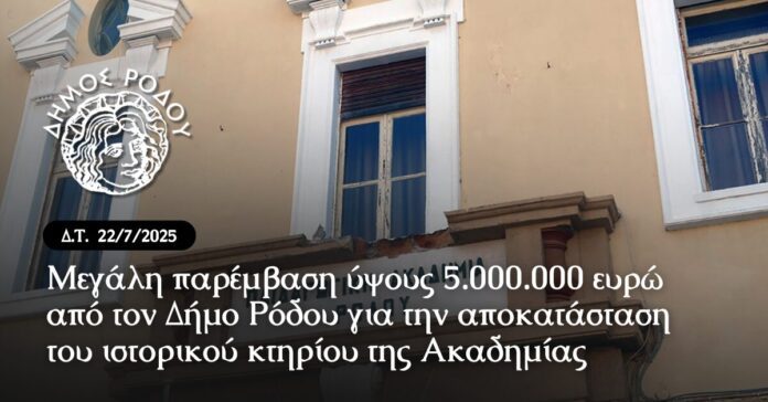 Στην επισκευή και αναβάθμιση του σχολικού συγκροτήματος της Ακαδημίας προχωρά ο Δήμος Ρόδου, με συνολικό προϋπολογισμό 5.059.324 ευρώ.