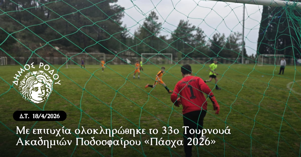 Με ιδιαίτερη επιτυχία και μεγάλη συμμετοχή ολοκληρώθηκε το 33ο Τουρνουά Ακαδημιών Ποδοσφαίρου-Πάσχα 2026, το οποίο διοργάνωσε η Διεύθυνση Αθλητισμού του Δήμου Ρόδου, κατά το χρονικό διάστημα από τις 14 έως τις 16 Απριλίου 2026. Η διοργάνωση πραγματοποιήθηκε στις αθλητικές εγκαταστάσεις του Δήμου Ρόδου, φιλοξενώντας περισσότερους από 400 νεαρούς αθλητές και αποτελώντας μια μεγάλη γιορτή του παιδικού ποδοσφαίρου.