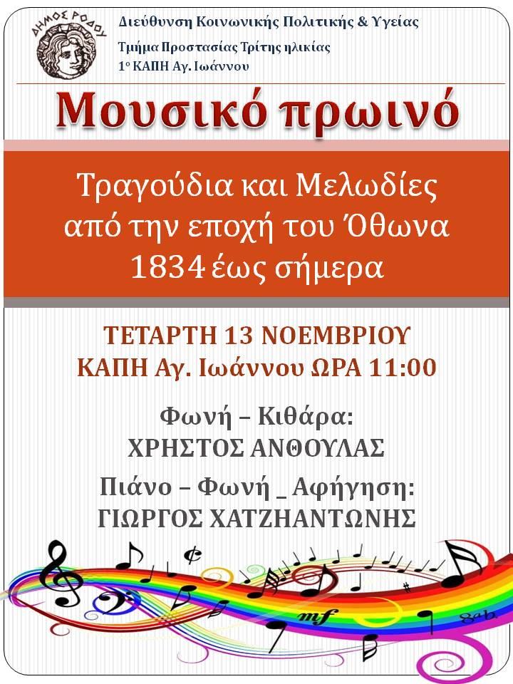 Σας καλούμε λοιπόν να ταξιδέψετε μαζί μας σε ένα «Μουσικό Πρωινό» με ήχους, ρυθμούς μελωδίες και οπτικό υλικό από την εποχή του Όθωνα το 1834 μέχρι και σήμερα, που θα λάβει χώρα στο ΚΑΠΗ Δήμου Ρόδου (Αγ. Ιωάννη 54) την Τετάρτη 13 Νοεμβρίου και ώρα 11:00.