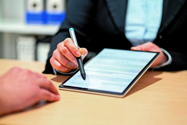 Close up of an executive hands holding a pen with digital tablet and indicating where to sign a contract at office