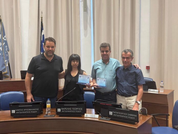 Μια σεμνή και συγκινητική τελετή πραγματοποιήθηκε χθες στην αίθουσα του δημοτικού συμβουλίου της Ρόδου, όπου ο δήμος τίμησε την εξαιρετική επιτυχία της Καθολικής και του Δημήτρη Θαρρενού. Τα δύο αυτά ξεχωριστά άτομα, που ζουν με αναπηρία όρασης, κατέκτησαν την 1η θέση στον Διεθνή Διαγωνισμό Τραγουδιού για Άτομα με Αναπηρία Όρασης, που έλαβε χώρα τον περασμένο Μάιο, ερμηνεύοντας το τραγούδι τους «Θα τραγουδώ όσο ζω».