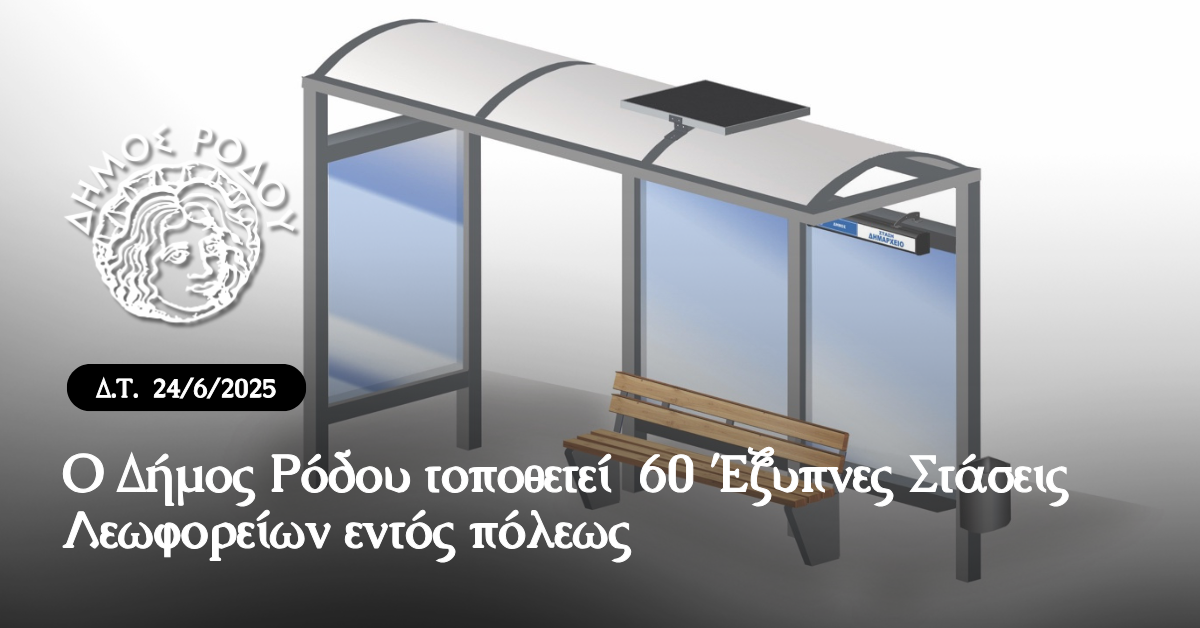 Ο Δήμος Ρόδου προβαίνει άμεσα στην εγκατάσταση εξήντα «έξυπνων» στεγάστρων λεωφορείων εντός πόλεως, καθώς η Δημοτική Επιτροπή στη συνεδρίασή της τη Δευτέρα 23 Ιουνίου ενέκρινε το αποτέλεσμα του σχετικού διαγωνισμού στο πλαίσιο του οποίου αναδείχτηκε ο ανάδοχος του έργου.