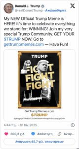 Το $TRUMP, που προωθείται ως “το μόνο επίσημο Trump meme”, σημείωσε εκρηκτική άνοδο άνω του 600% στις πρώτες ώρες διαπραγμάτευσης, φτάνοντας σε τιμή πάνω από 32 δολάρια. Η συνολική κεφαλαιοποίηση της αγοράς ξεπέρασε τα 32 δισεκατομμύρια δολάρια, κατατάσσοντας το νόμισμα στα 30 μεγαλύτερα κρυπτονομίσματα παγκοσμίως.