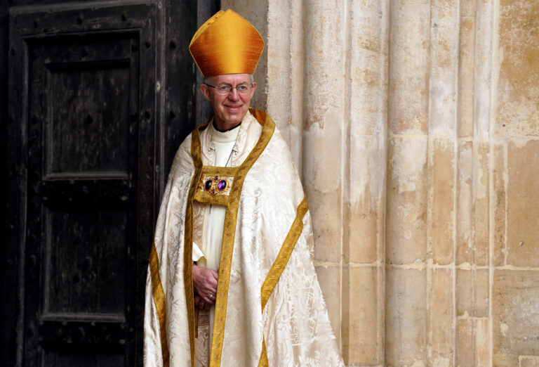 (FILES) Archbishop of Canterbury Justin Welby smiles at Westminster Abbey in central London on May 6, 2023, ahead of the coronations of Britain's King Charles III and Britain's Camilla, Queen Consort. The leader of the world's Anglican communion, Justin Welby, faced growing pressure on November 11, 2024, to resign after a damning report which concluded the Church of England had covered up a serial abuse case. (Photo by Andrew Milligan / POOL / AFP)