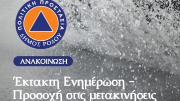 Η Πολιτική Προστασία του δήμου Ρόδου καλεί τους πολίτες να είναι ιδιαίτερα προσεκτικοί στις μετακινήσεις τους, λόγω της εκδήλωσης έκτακτων καιρικών φαινομένων στην περιοχή από σήμερα 30/4 το απόγευμα, έως τις απογευματινές ώρες της Πέμπτης 1/5.