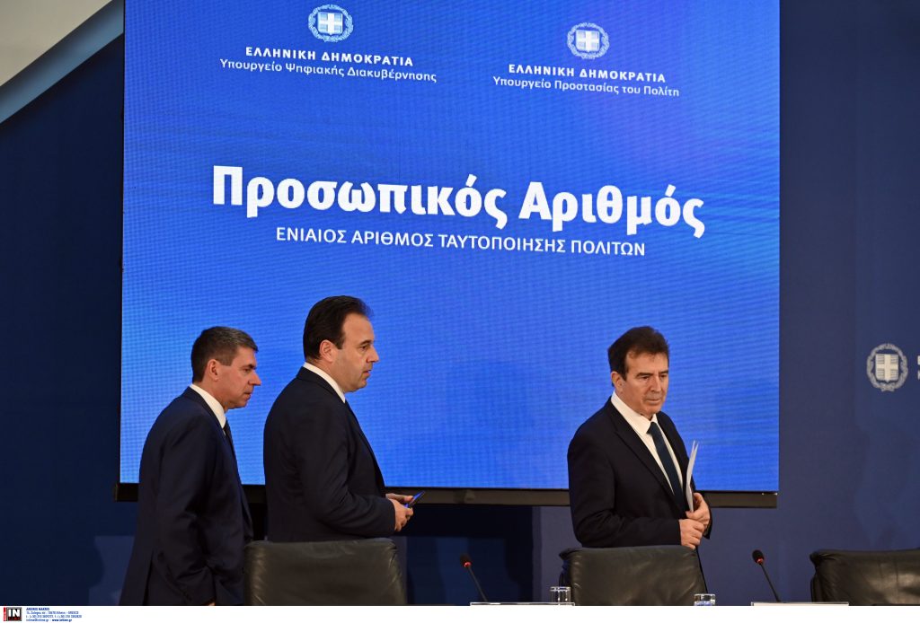 Παρουσιάζεται ο Προσωπικός Αριθμός σε συνέντευξη τύπου που δίνουν το πρωί της Δευτέρας 2 Ιουνίου ο υπουργός Ψηφιακής Διακυβέρνησης Δημήτρης Παπαστεργίου, ο υπουργός Προστασίας του Πολίτη Μιχάλης Χρυσοχοΐδης και υπηρεσιακοί παράγοντες