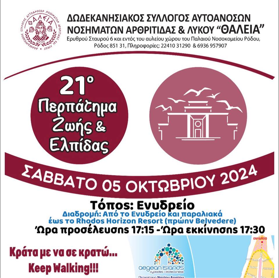 Η πρόεδρος Θάλεια Γεωργά και τα μέλη της ομάδας Περπατήματος του Δωδεκανησιακού Συλλόγου Αυτοάνοσων Νοσημάτων Αρθρίτιδας & Λύκου «ΘΑΛΕΙΑ», προετοιμάζονται για το 21ο Περπάτημα Ζωής & Ελπίδας! 2003-2024. 21 χρόνια Περπάτημα Ζωής & Ελπίδας!
