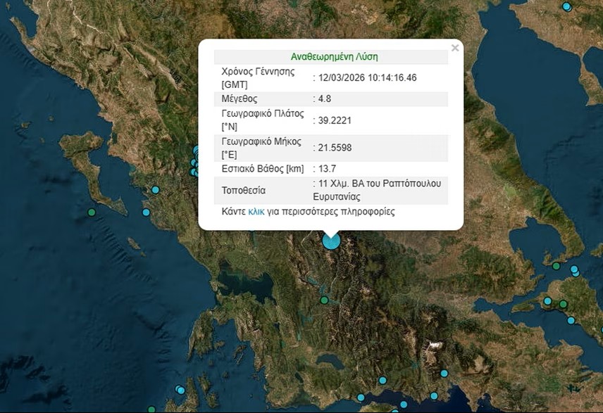 Σεισμός μεγέθους 4,8 βαθμών της κλίμακας Ρίχτερ, με επίκεντρο τα σύνορα των νομών Ευρυτανίας και Καρδίτσας, σημειώθηκε το μεσημέρι της Πέμπτης