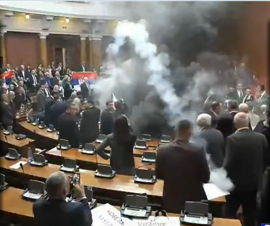 Σε πεδίο μάχης μετατράπηκε η αίθουσα συνεδριάσεων της σερβικής βουλής. Βουλευτές της αντιπολίτευσης αντιδρώντας στην ημερήσια διάταξη που υιοθετήθηκε από την πλειοψηφία προσπάθησαν να διακόψουν την συνεδρίαση πετώντας καπνογόνα, ανάβοντας πυρσούς και εκσφενδονίζοντας αυγά κατά των βουλευτών της συμπολίτευσης.