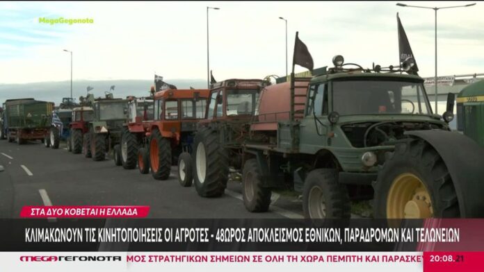 Την περαιτέρω κλιμάκωση των κινητοποιήσεών τους, αποφάσισαν οι αγρότες καθώς σύμφωνα με την ομόφωνη απόφαση που έλαβαν στην πανελλαδική σύσκεψη της Κυριακής στα Μάλγαρα και τα 62 μπλόκα που συμμετείχαν σε αυτή, την Πέμπτη 8 Ιανουαρίου μέχρι και τα μεσάνυχτα της Παρασκευής θα αποκλείσουν τις εθνικές οδούς, τους παραδρόμους και τα τελωνεία.