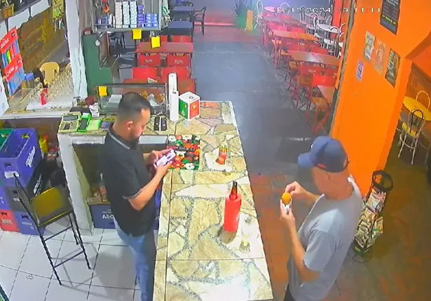 Ο ιδιοκτήτης του κυλικείου, Christian de Souza Amaral, στέκεται σοκαρισμένος καθώς ο ζαλισμένος αγοραστής προσπαθεί να σκουπίσει το πρόσωπό του.