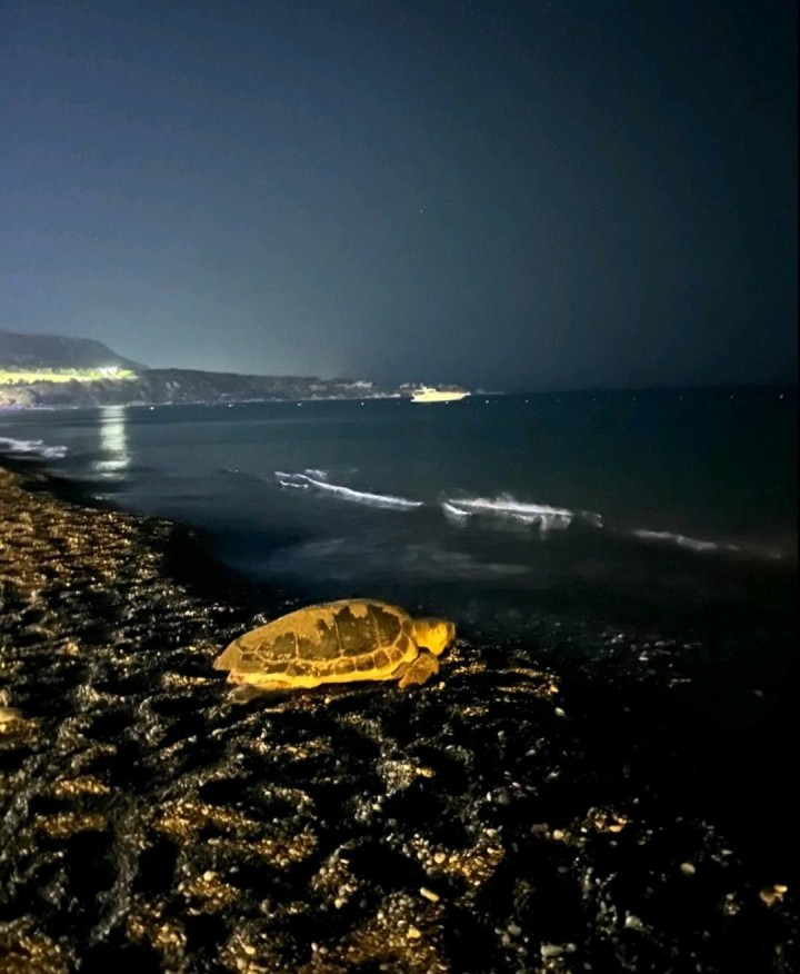 Μια μοναδική και συγκινητική στιγμή εκτυλίχθηκε το βράδυ της Τετάρτης 24 Ιουλίου στην παραλία κάτω από τις Πηγές Καλλιθέας Ρόδου, μπροστά στα μάτια έκπληκτων επισκεπτών του ξενοδοχείου Rodos Palladium. Μια θαλάσσια χελώνα, πιθανότατα του προστατευόμενου είδους Caretta caretta, βγήκε στην ακτή για να ωοτοκήσει, σε μια σπάνια στιγμή που καταγράφηκε με σεβασμό και δέος από όσους την παρακολούθησαν.