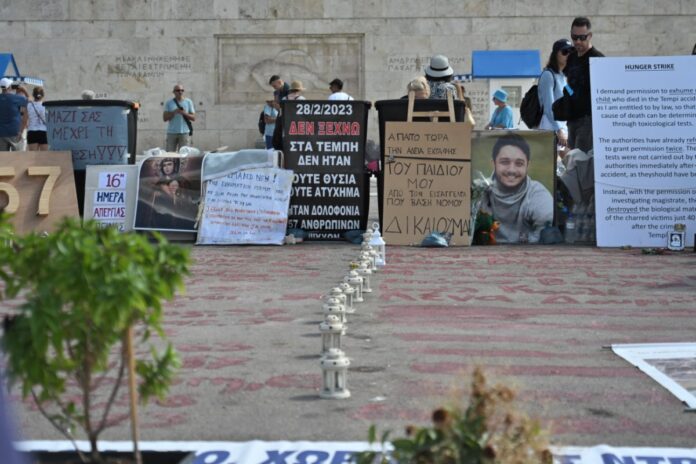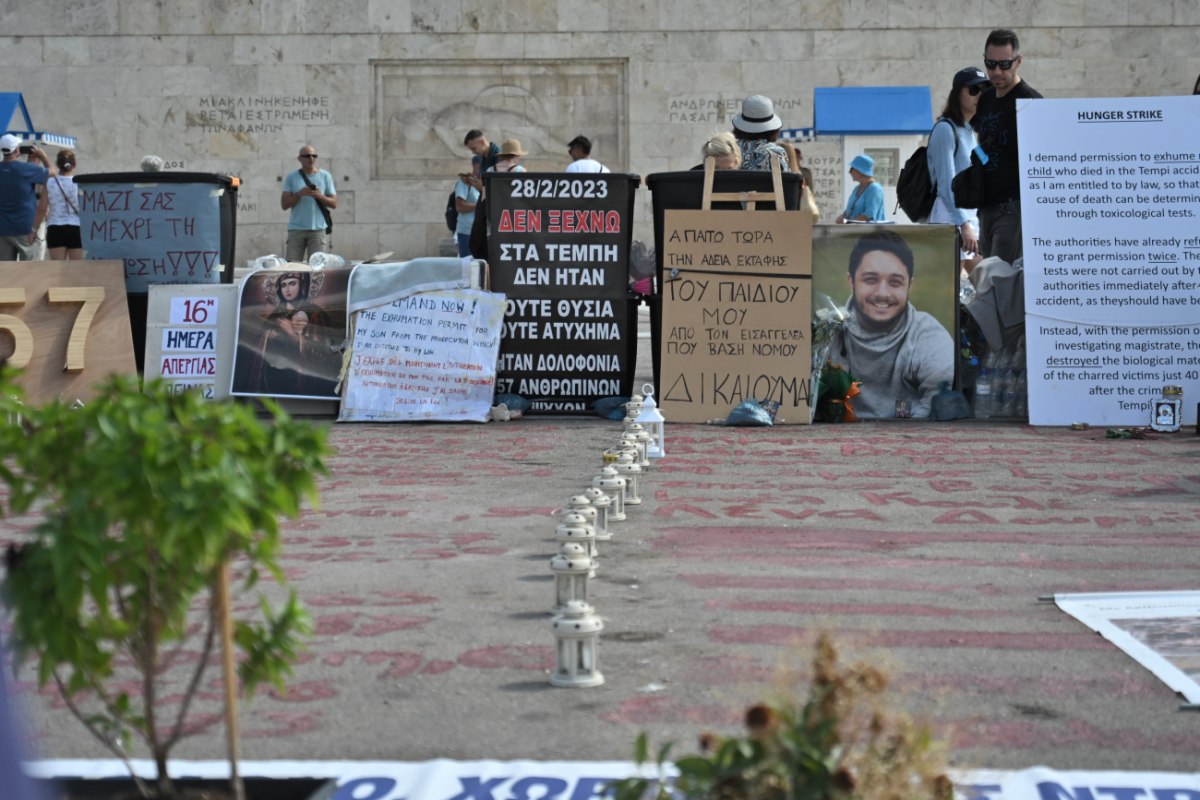 Στην πλατεία Συντάγματος, μπροστά από τη Βουλή όπου είναι γραμμένα τα ονόματα των 57 θυμάτων στα Τέμπη, εξακολουθεί να βρίσκεται ο Πάνος Ρούτσι, πατέρας του αδικοχαμένου Ντένις Ρούτσι, συνεχίζοντας την απεργία πείνας για 17η ημέρα.