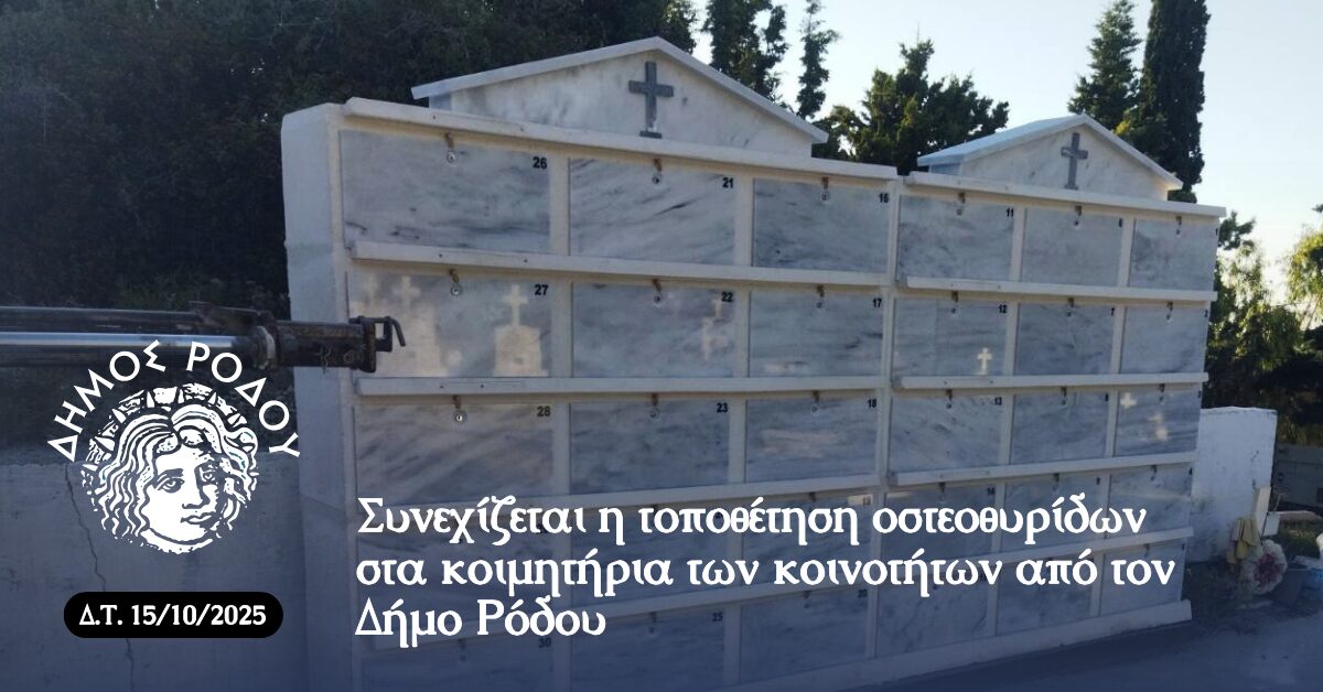 Η Δημοτική Αρχή του Αλέξανδρου Κολιάδη, με γνώμονα την αποτελεσματική και υπεύθυνη διαχείριση των κοιμητηρίων, έχει προχωρήσει στην τοποθέτηση οστεοθυρίδων σε διάφορες κοινότητες του νησιού, ανταποκρινόμενη στην αυξανόμενη έλλειψη διαθέσιμων και επαρκών χώρων ταφής.
