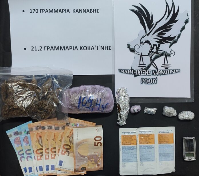 Η Υποδιεύθυνση Ασφαλείας Ρόδου προχώρησε στη σύλληψη 32χρονου αλλοδαπού που κατηγορείται για κατοχή και διακίνηση ναρκωτικών ουσιών. Συγκεκριμένα, μετά από στοχευμένο έλεγχο, βρέθηκαν στην κατοχή του 170 γραμμάρια κάνναβης, 21,2 γραμμάρια κοκαΐνης, πέντε φαρμακευτικά σκευάσματα, ζυγαριά ακριβείας, κινητό τηλέφωνο και 360 ευρώ. Επίσης, διαπιστώθηκε ότι ο συλληφθείς διέμενε παράνομα στη χώρα. Ο δράστης οδηγήθηκε στην Εισαγγελία Πρωτοδικών Ρόδου. Η υπόθεση αποτελεί μέρος ευρύτερων επιχειρήσεων κατά της διακίνησης ναρκωτικών στο Νότιο Αιγαίο.