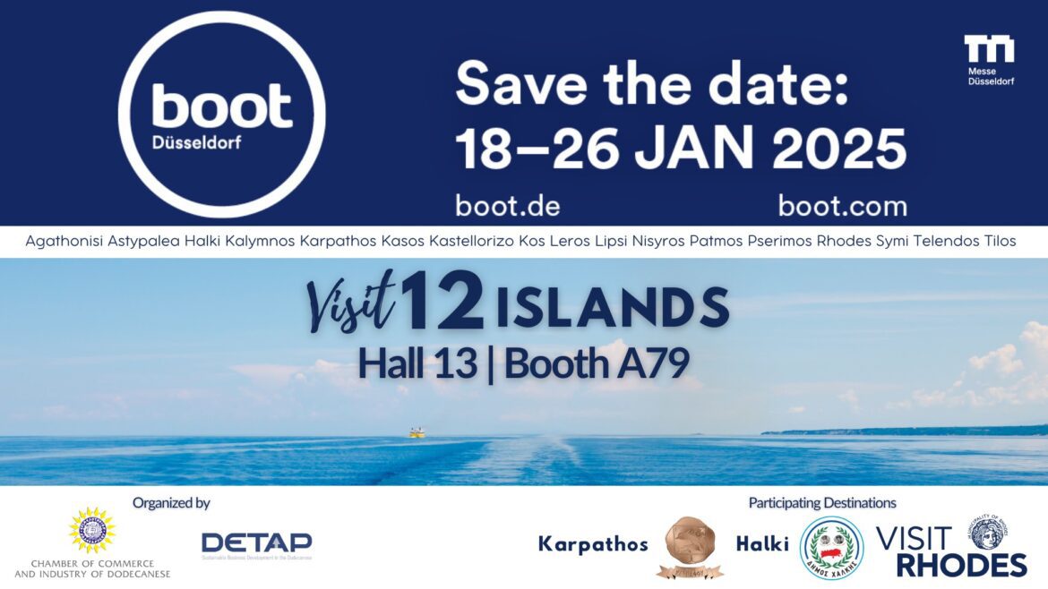 Το Επιμελητήριο Δωδεκανήσου θα δώσει και φέτος το «παρών» στη μεγαλύτερη διεθνή έκθεση θαλάσσιου τουρισμού, την BOOT 2025, η οποία θα φιλοξενηθεί στο Ντίσελντορφ της Γερμανίας από τις 18 έως τις 26 Ιανουαρίου 2025. Πρόκειται για την τρίτη συνεχή συμμετοχή του Επιμελητηρίου στη συγκεκριμένη διοργάνωση, επιβεβαιώνοντας τη στρατηγική επιδίωξη για ανάπτυξη και ενίσχυση του θαλάσσιου τουρισμού στα Δωδεκάνησα.