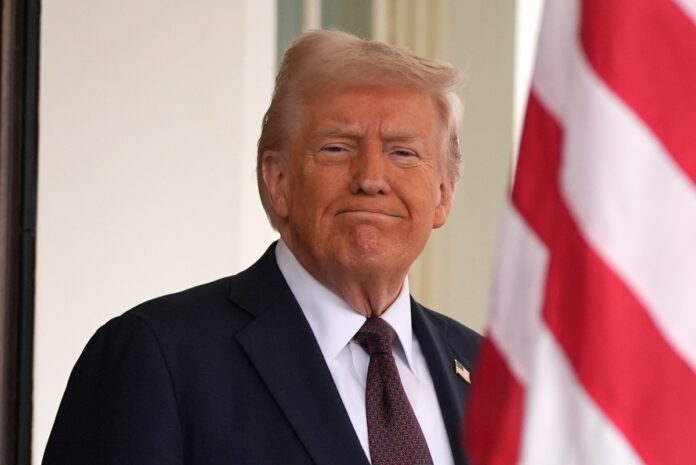 President Donald Trump stands before British Prime Minister Keir Starmer arrives at the White House, Thursday, Feb. 27, 2025, in Washington. (AP Photo/Evan Vucci)