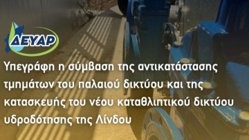 Υπεγράφη η σύμβαση για την αντικατάσταση τμημάτων του παλαιού δικτύου και την κατασκευή του νέου καταθλιπτικού δικτύου υδροδότησης της Λίνδου, βάζοντας τέλος σε ένα χρόνιο πρόβλημα που ταλάνιζε την ευρύτερη περιοχή.