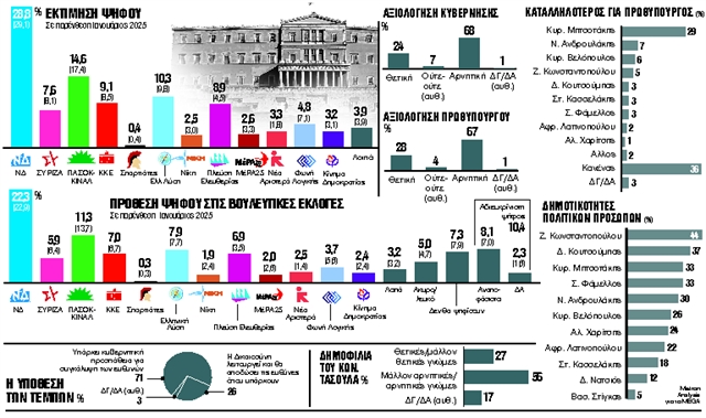 Σε ό,τι αφορά την εκτίμηση ψήφου, η ΝΔ προηγείται με 28,8%, με μικρή πτώση από τον Ιανουάριο, που είχε μετρηθεί στο 29,1%.