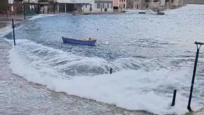 Εικόνες έντονης θαλασσοταραχής καταγράφηκαν σε Καστελλόριζο και Χάλκη, όπου η θάλασσα εισχώρησε στα στενά και τις πλατείες των οικισμών, φτάνοντας σε αρκετά σημεία μέχρι τις εισόδους κατοικιών. Οι δρόμοι καλύφθηκαν από νερό, με τους κατοίκους να παρακολουθούν την εξέλιξη του φαινομένου.