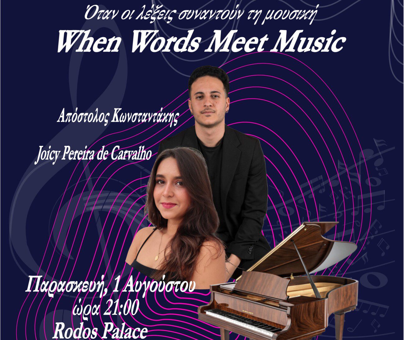 Στο πλευρό της, ο διακεκριμένος Ροδίτης πιανίστας Απόστολος Κωνσταντάκης, με διεθνή βραβεία και εμφανίσεις σε σημαντικές αίθουσες Ευρώπης και Αμερικής, θα προσφέρει τη δεξιοτεχνία του ως συνοδός και σολίστας.
