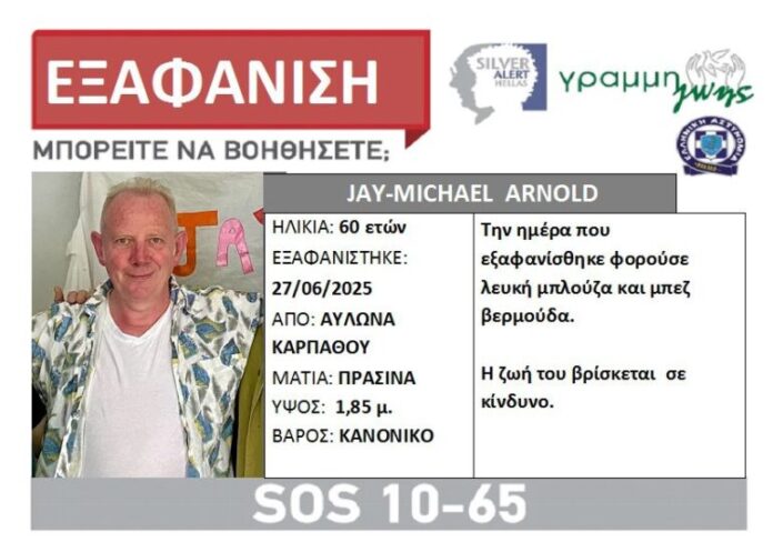 Σε κατάσταση συναγερμού βρίσκονται οι αρχές στην Κάρπαθο, μετά την εξαφάνιση του 60χρονου Jay-Michael Arnold, ο οποίος αγνοείται από το πρωί της 27ης Ιουνίου 2025.